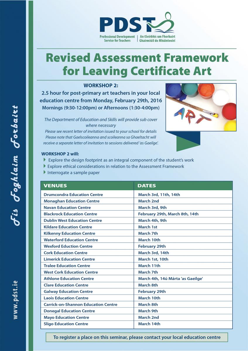 Please see attached a flyer advertising Workshop 2 for the Revised Assessment Framework for Leaving Certificate Art. A letter of invitation has been sent to your schools in the past number of days/weeks.