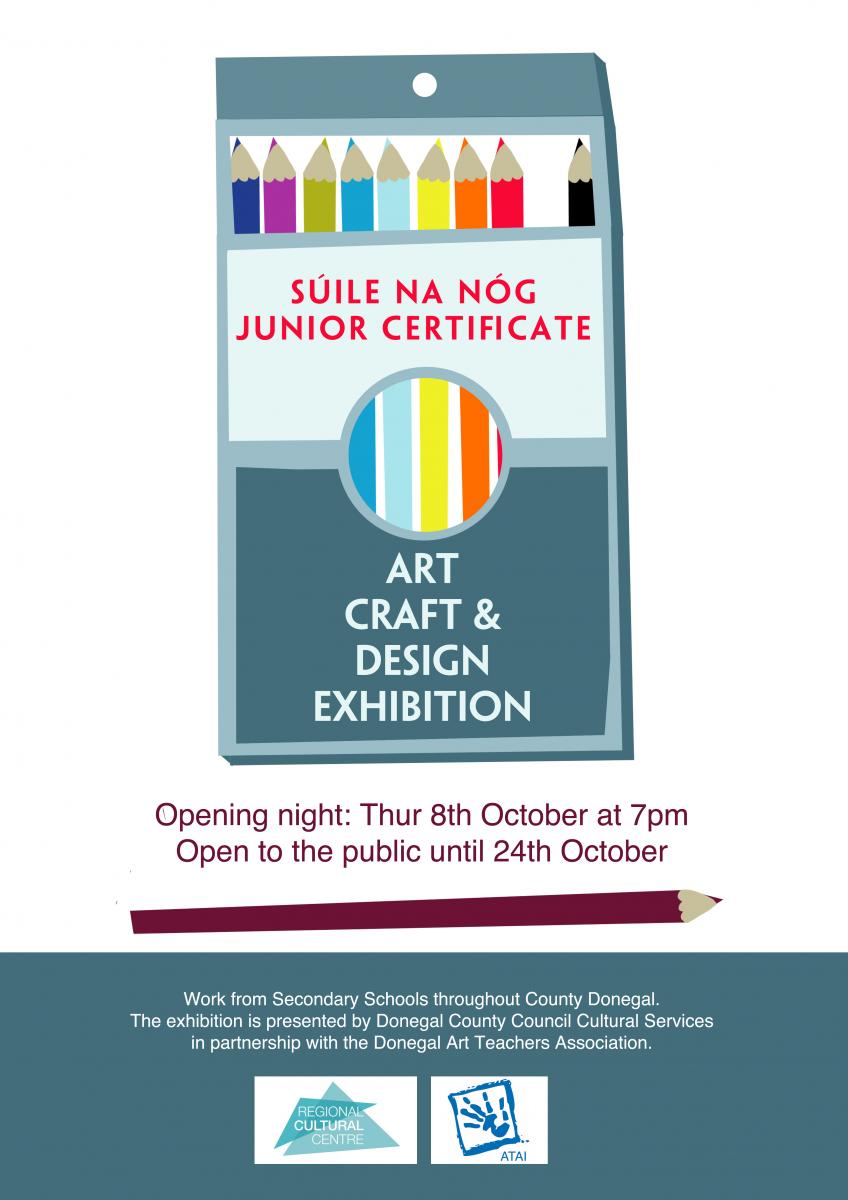 The Donegal Branch of the Art Teachers’ Association are delighted to announce the opening of their annual Junior Cert Art, Craft and Design Exhibition ‘Súile Na Nóg‘. Opening night is Thursday 8th of October. Doors open at 19:00 and the exhibition will run until the 24th og October. See poster below.